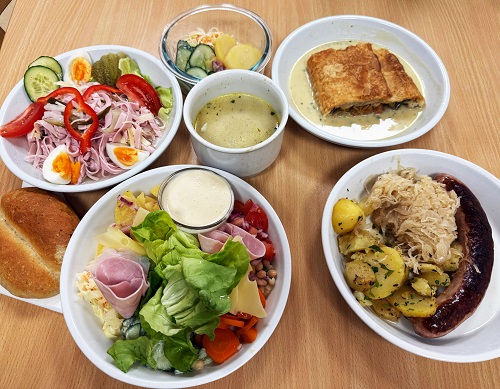 Every day, there are several menus to choose from, which can be conveniently ordered in advance. The meals are served on porcelain plates with covers and delivered in insulated polystyrene boxes. A specially purchased oven keeps the portions warm for a long time so that the food can be enjoyed at the individual’s break time.
